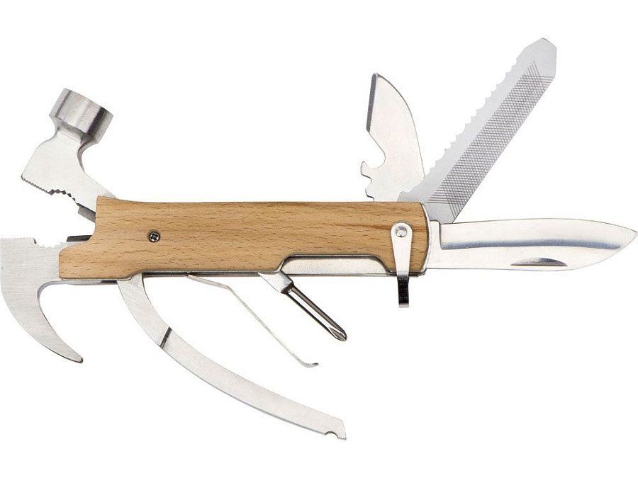 Многофункциональный инструмент, который выручит дома, на даче, в путешествии, походе и во множестве других ситуаций. Полностью сделан из металла и декорирован накладками из натурального дерева. Чехол в комплекте.