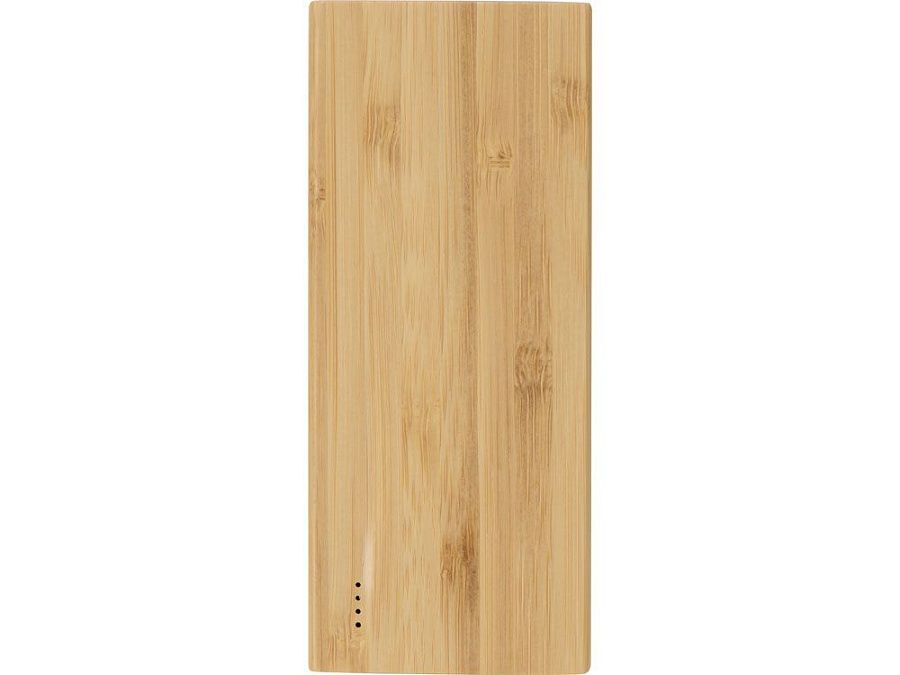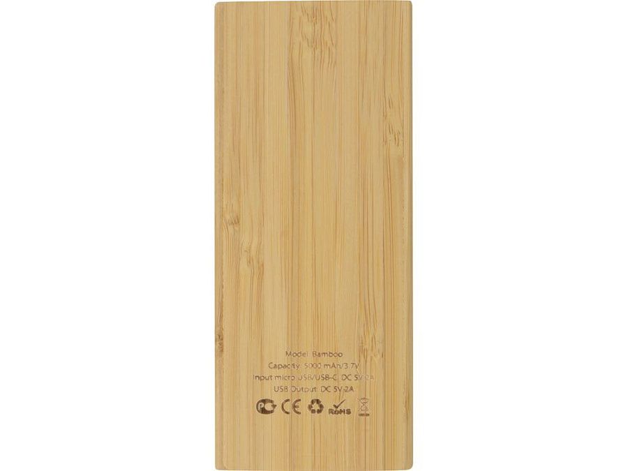 Компактный повербанк из бамбука размером меньше смартфона. Натуральный материал эстетичен на вид и приятен на ощупь. Литий-полимерный аккумулятор на 5000 мАч обеспечит от полутора до двух полных зарядок среднего смартфона. Внешний аккумулятор имеет 2 входных разъема (micro USB, USB-C) и один выходной разъем USB. В комплекте кабели micro USB, USB-C, Lightning / iPhone. Поставляется в крафт упаковке из переработанной бумаги.