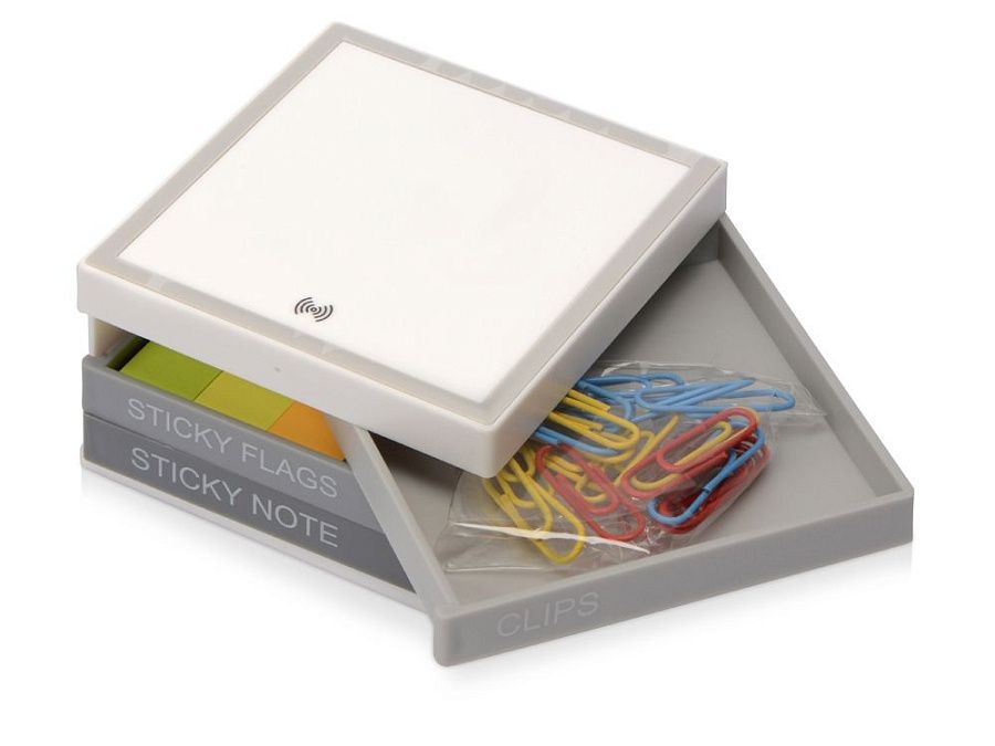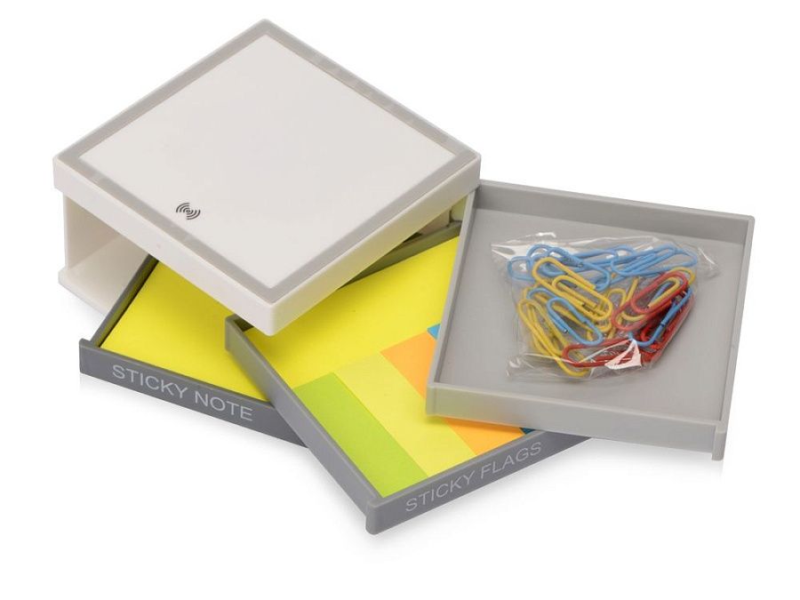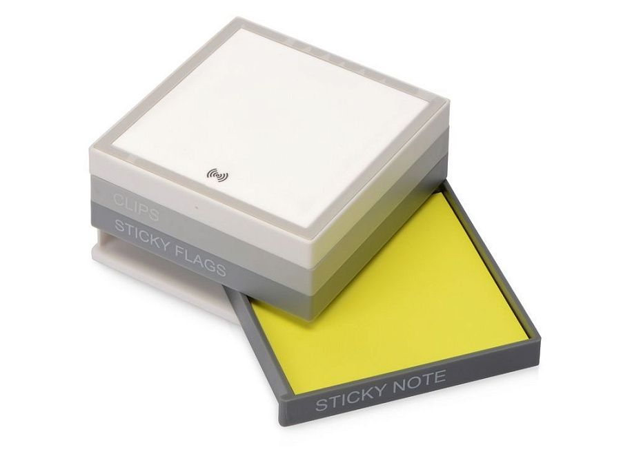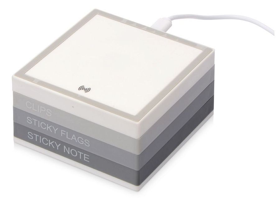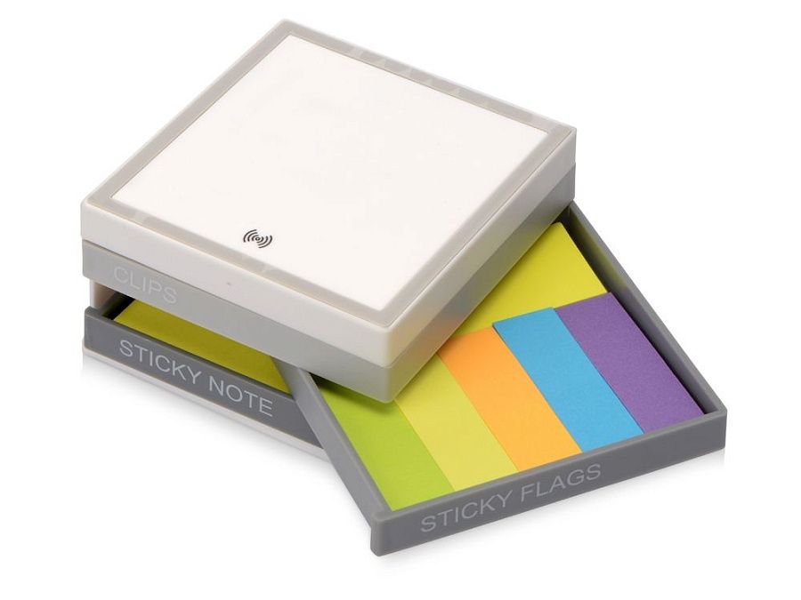 Органайзер Chaos с функцией беспроводной зарядки – современный бизнес-подарок, объединяющий в себе функциональность и современный подход к организации рабочего пространства. Три выдвигающиеся подставки уже содержат скрепки, самоклеящиеся стикеры и стикеры-закладки. Органайзер подходит для беспроводной зарядки и хранения смартфона, поддерживающего функцию беспроводной зарядки, и различных канцелярских аксессуаров. Работает от кабеля Micro-USB. В комплект входит кабель Micro-USB.