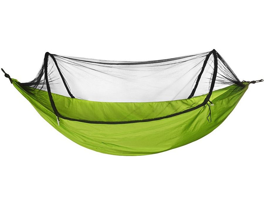 Гамак легко закрепляется на деревьях или каких-либо опорах, с помощью карабинов и веревок, которые идут в комплекте. Легко складывается в индивидуальный мешок, на котором отлично будет смотреть логотип или корпоративный слоган.