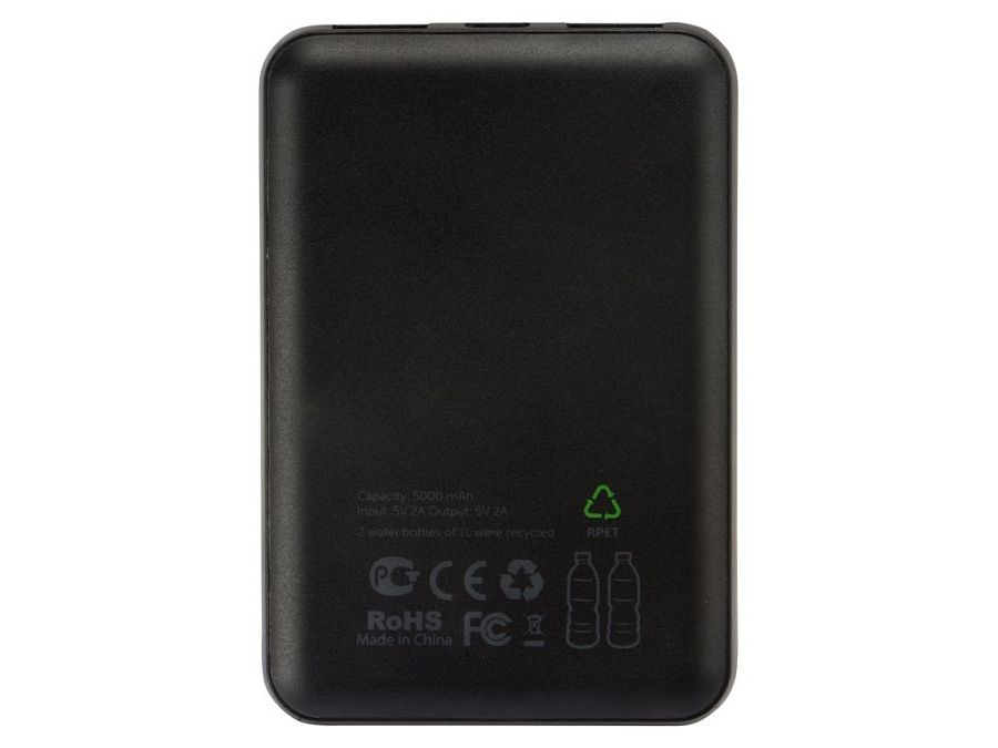 Компактный и стильный повербанк. Корпус, включая поверхность с отделкой "под ткань", на 100% состоит из переработанного ПЭТ-пластика. Для его изготовления было использовано две литровых одноразовых пластиковых бутылки. Универсальный внешний аккумулятор поставляется в крафтовой упаковке с использованием растительных чернил на основе сои. Повербанк имеет 2 выходных USB разъема, входные разъемы USB-C и micro USB, а также кабель 3-в-1.
