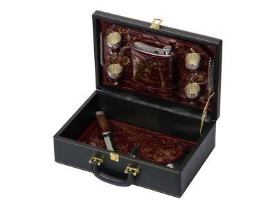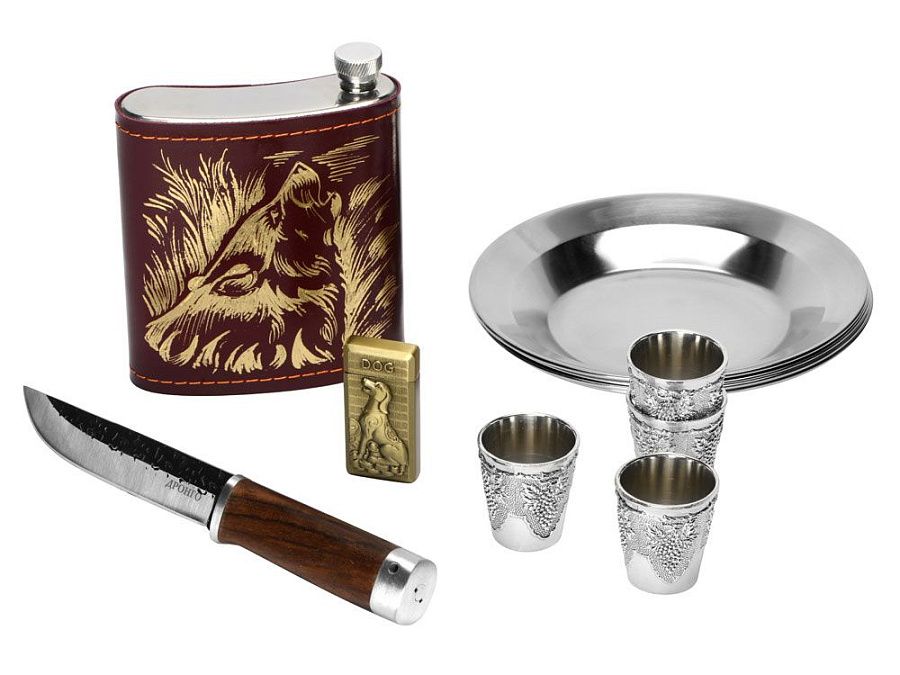 тарелка d18,3 х 2,5 см - 4шт, нож 23,5 х 3 х 2,3 см, зажигалка 3,3 х 6,7 х 1,2 см, стопка d4,3 х 4,9 см - 4шт, фляга 12,7 х 16 х 4 см