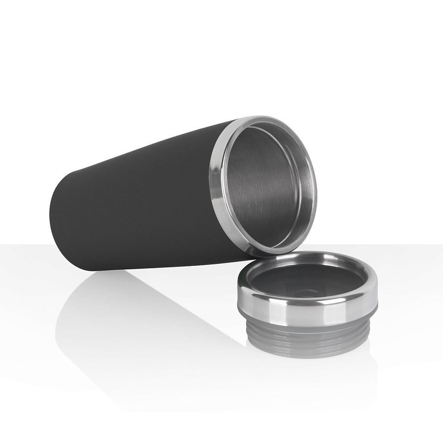 Внешняя стенка термостакана изготовлена из нержавеющей стали с уникальным прорезиненным напылением soft-touch, а внутренняя стенка выполнена из высококачественной пищевой, нержавеющей стали. Корпус изделия персонализируется по окружности встык. У термостакана отвинчивающаяся крышка.