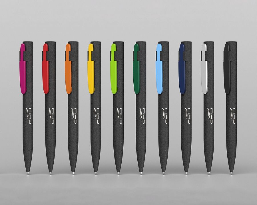 Оригинальное сочетание черного корпуса ручки в покрытии SOFTGRIP, обеспечивающем лёгкий массажный эффект, c цветным металлическим матовым клипом.