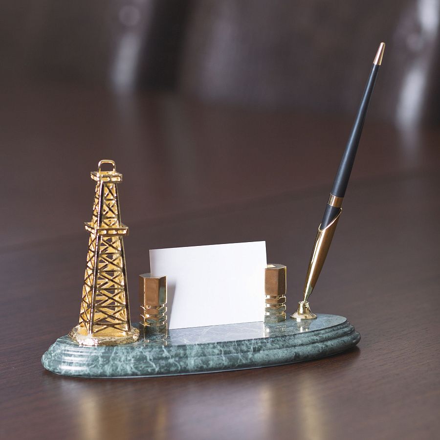Настольная подставка под визитки с тематическим оформлением «Нефтяная вышка» станет прекрасным дополнением рабочего стола руководителя или директора. Набор украшен фигурой в виде нефтяной вышки, элементы композиции идут с напылением под цвет золота.