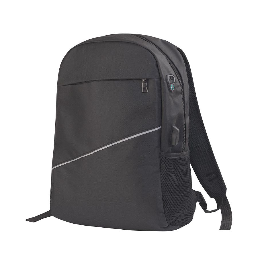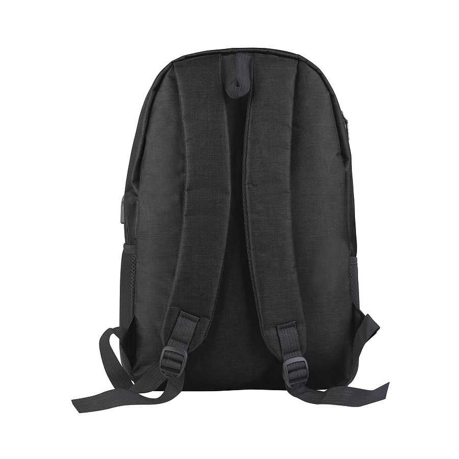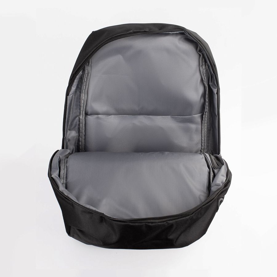 Рюкзак держит форму благодаря плотной вставке, внутри серый подклад. Сбоку имеется разъем для подключения зарядки и подготовка для проводных наушников, прорезь нужно сделать самостоятельно. На лицевой стороне расположен карман на молнии и дополнительный карман-сетка сбоку.
