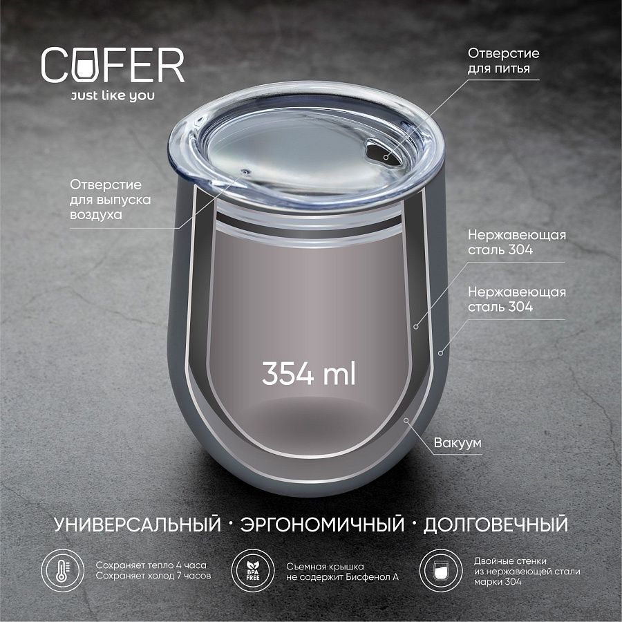 Характерная обтекаемая форма с расширяющейся нижней частью придает коферу оригинальность. Благодаря этой форме, кофер можно использовать для любых напитков: вода, чай, кофе, вино, коктейли - наливайте в кофер все, что захотите, напиток надолго сохранит свою температуру и вкус.