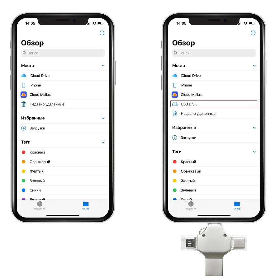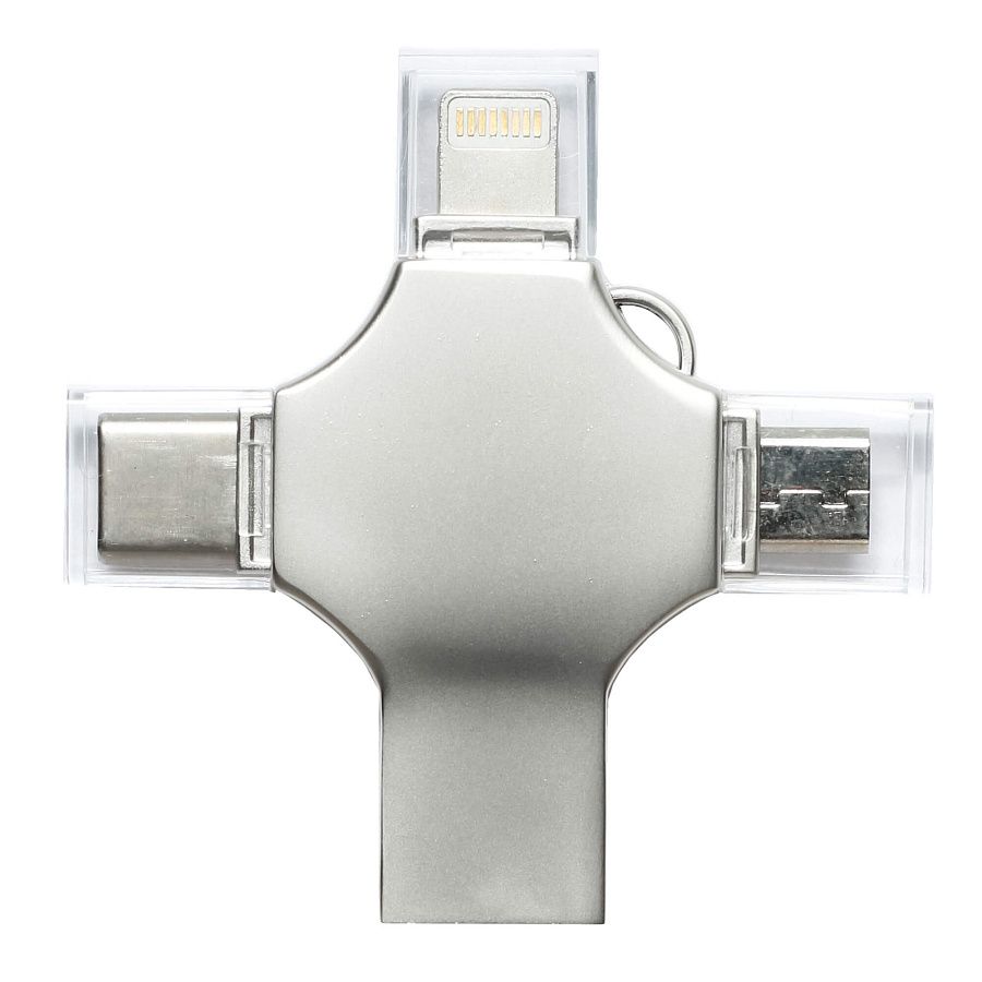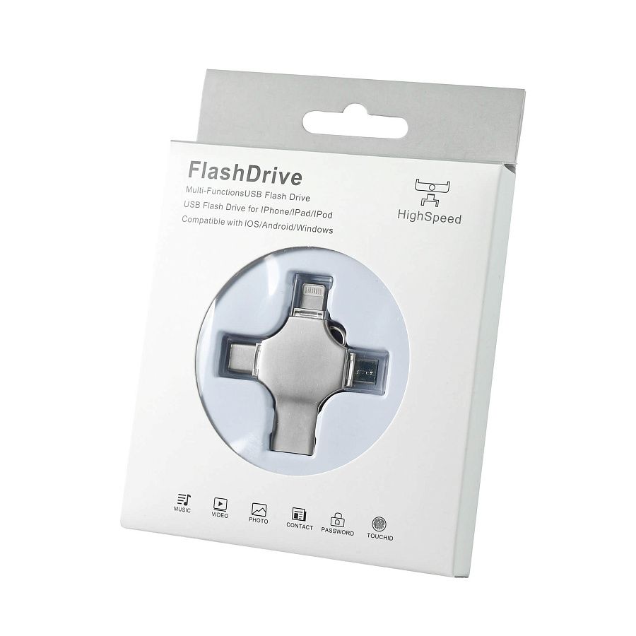 Универсальная флешка с быстрым чипом 3.0 имеет 4 разъема: USB, micro USB, USB-C (Type-C) и Lightning.