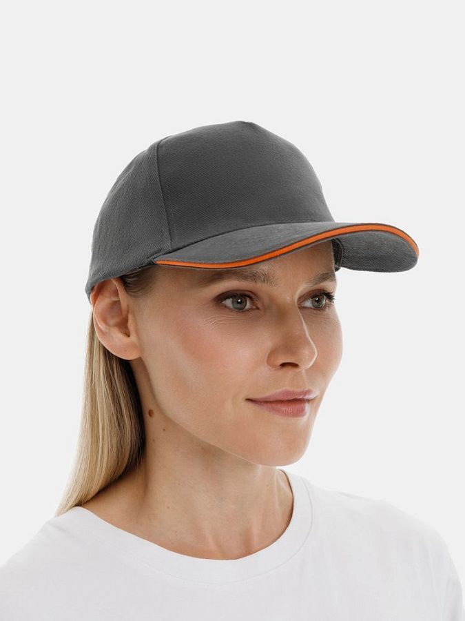 Модель бейсболки с 5-ю клиньями без лобового шва из плотного чесаного хлопка.