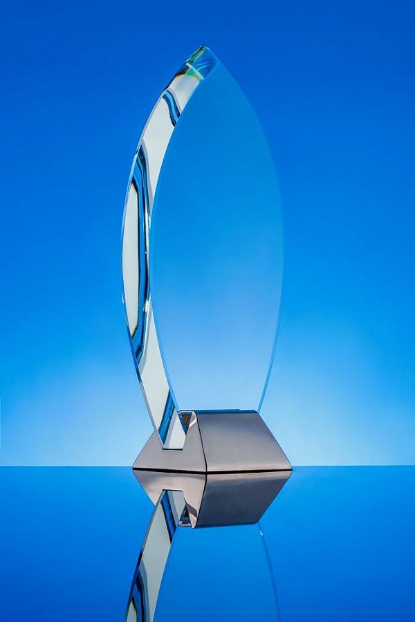 Конструкция награды разъемная: стеклянную часть стелы при необходимости можно вынуть из основания.