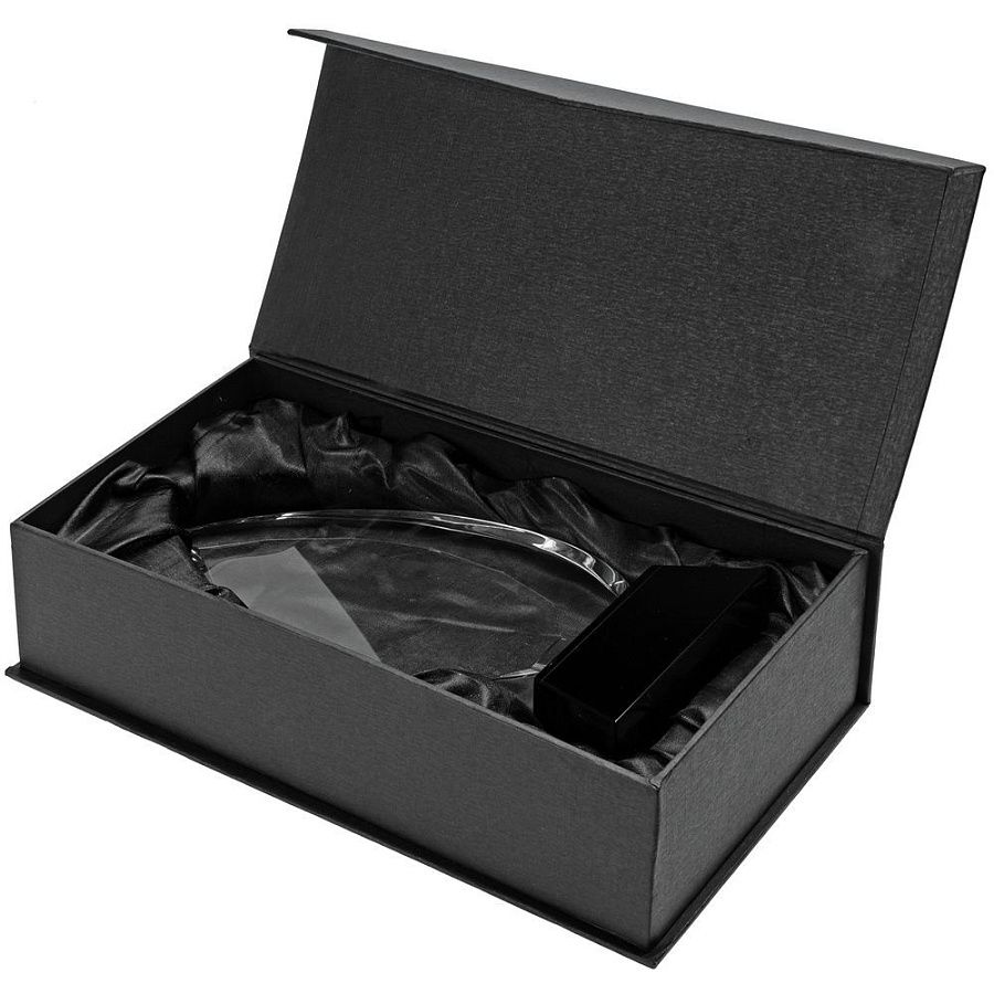 Стела изготовлена из стекла К9, в основе которого лежит оптическое боросиликатное стекло. Эту марку стекла отличает низкий процент посторонних включений, высокий показатель преломления и высокая прозрачность — идеальные качества для изготовления наград премиального уровня.