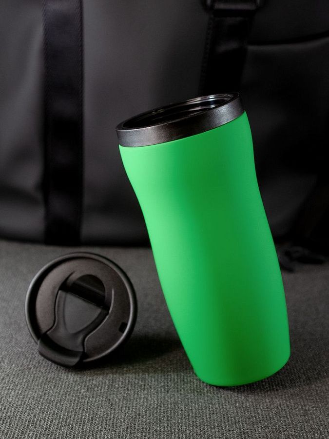 Двухслойная конструкция из нержавеющей стали снаружи и пищевого пластика внутри. Герметичная завинчивающаяся крышка с откидным клапаном для питья. Покрытие софт-тач. В отверстие в крышке можно вставить шнурок для удобного ношения стакана на руке. Шнурок в комплект не входит.