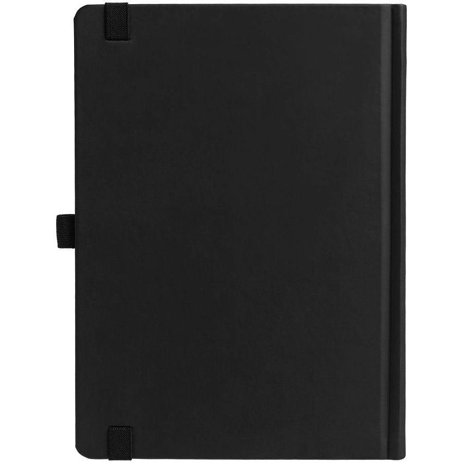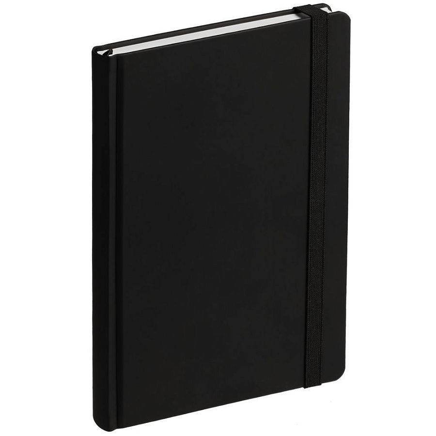 Ежедневник с твердой обложкой без поролона, выполнен из материала Soft Touch, черный АА, дополнен резинкой шириной 1 см, петлей-резинкой для ручки, капталом и ляссе черного цвета.