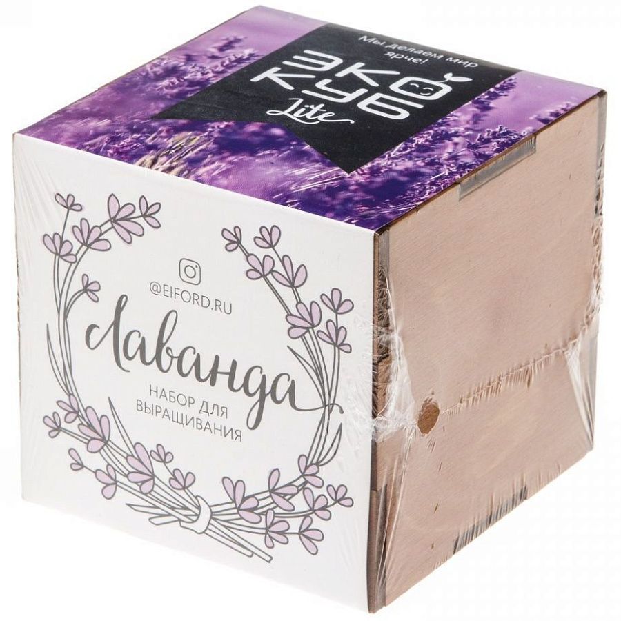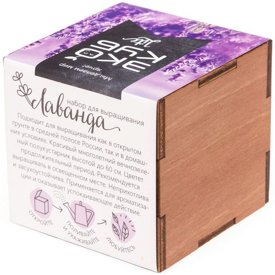 В наборе: деревянный куб, бумажный стаканчик, питательный грунт, семена, вермикулит.