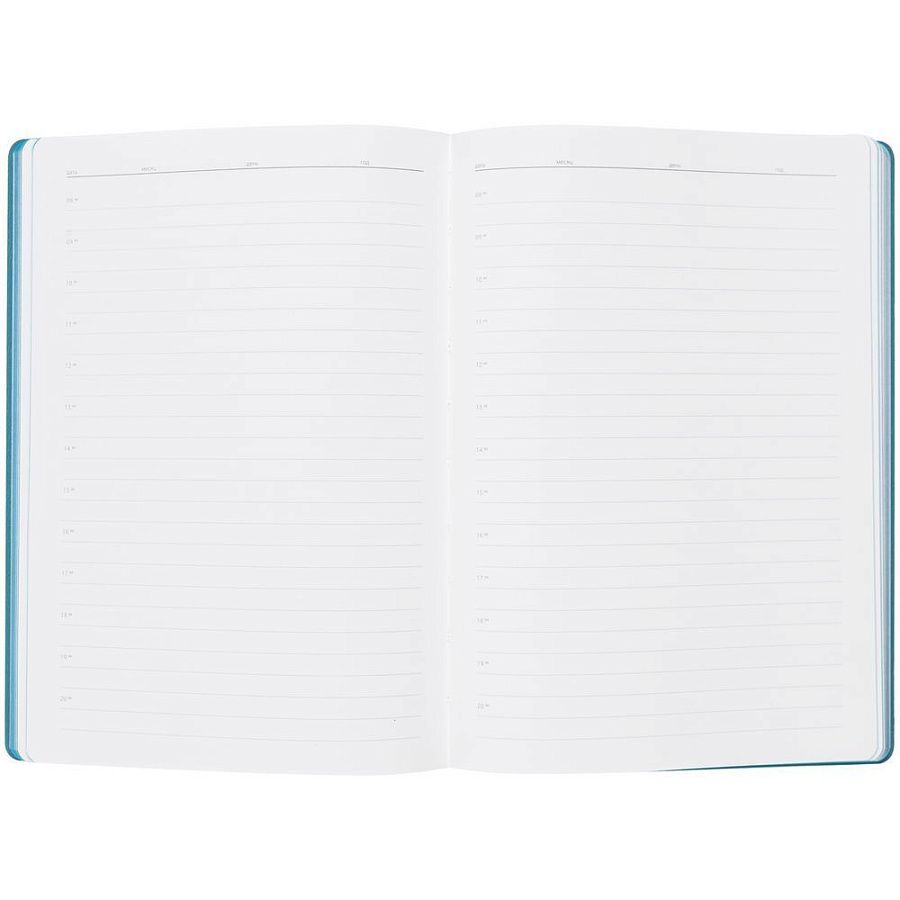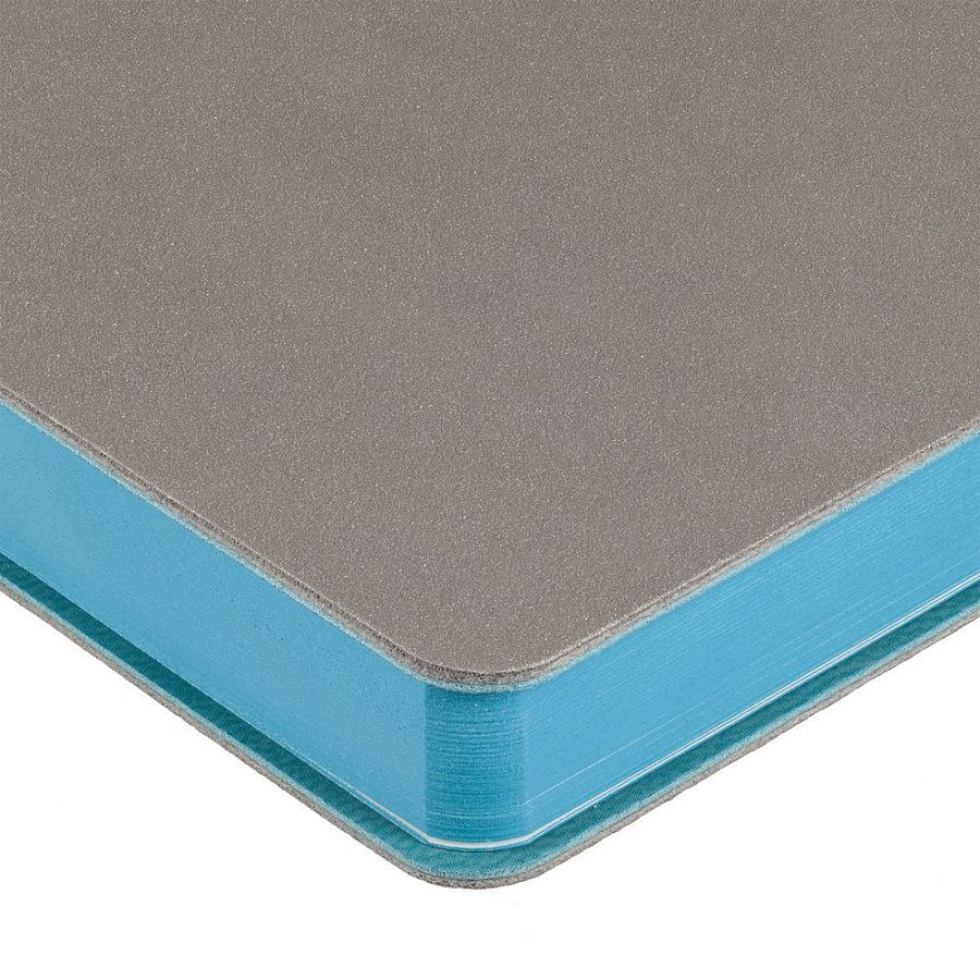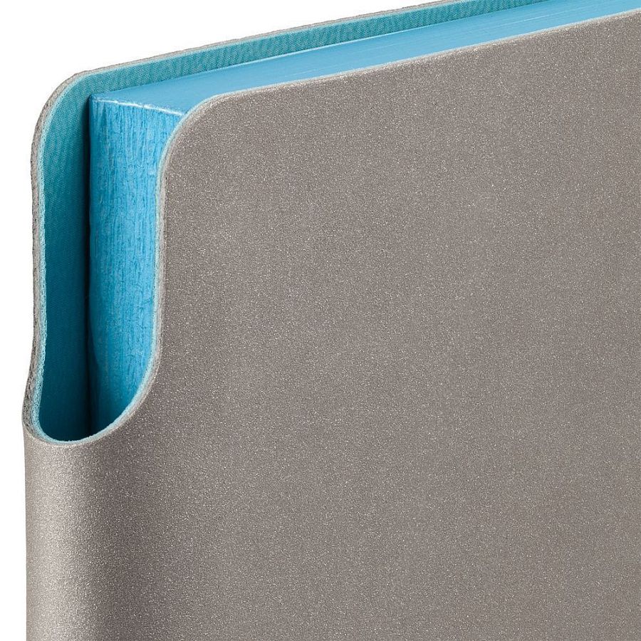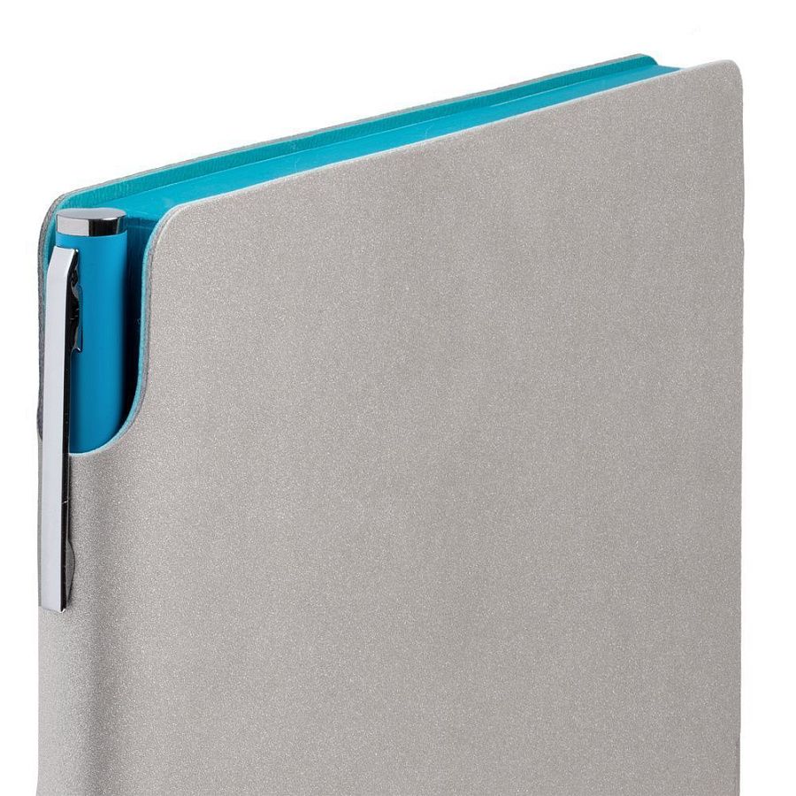 Гибкая обложка выполнена из материала Velour Melange, серый СС и Latte, бирюзовый II (внутренняя часть обложки). Внутри корешка — специальное место для крепления ручки размером до 15х0,9 см.