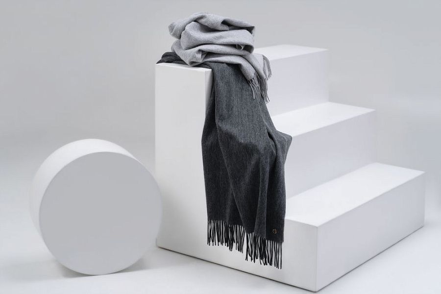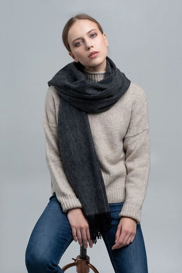 Широкий палантин с едва заметным узором плетения открывает простор фантазии — его можно использовать как шарф, головной убор или декоративный элемент для верхней одежды.