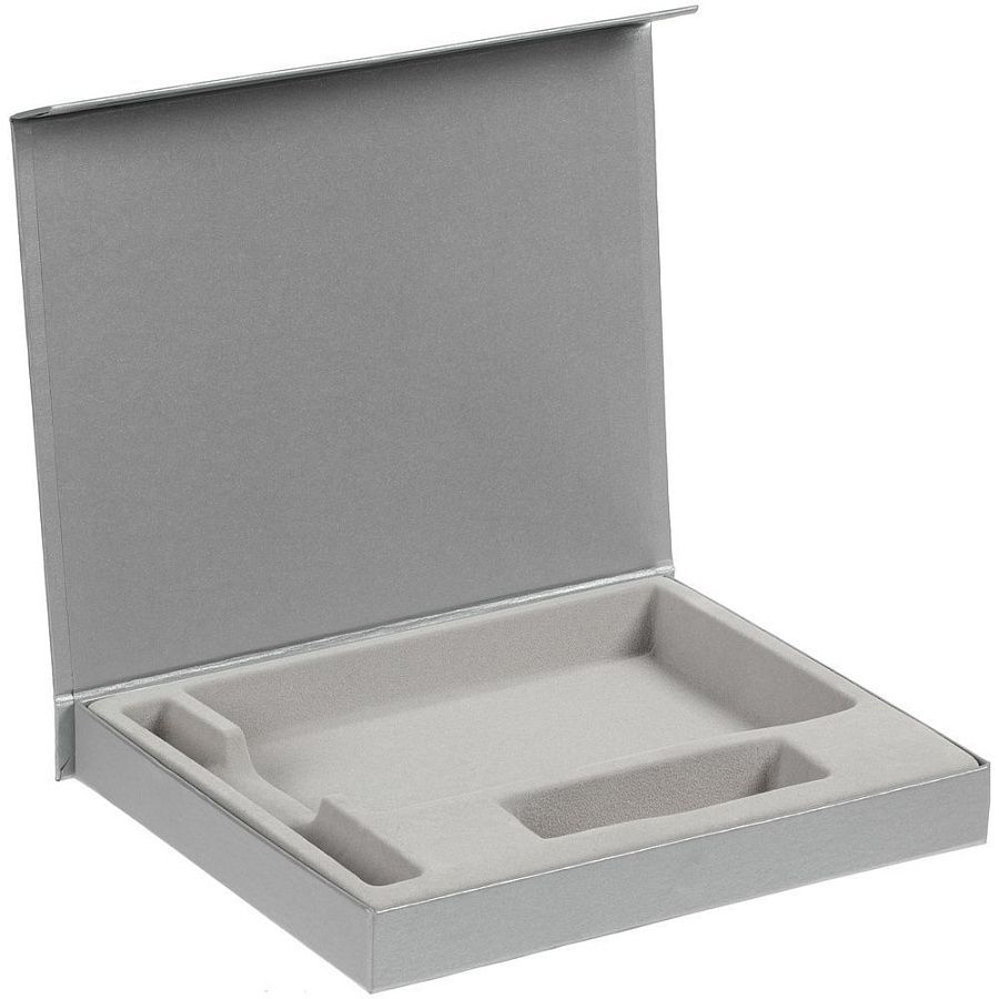 Коробка из переплетного картона, кашированного дизайнерской бумагой Galaxy Metallic, с крышкой на магните и флокированным ложементом.