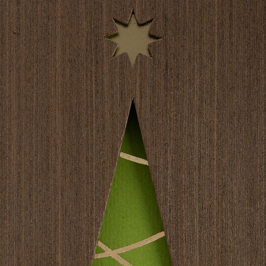 Под сдержанной обложкой из шпона венге скрывается настоящая праздничная феерия — яркая дизайнерская бумага, тисненая фольгой.