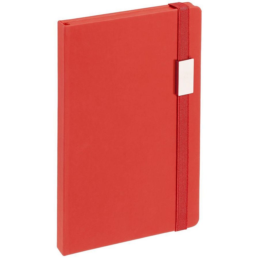 Блокнот в твердой обложке, выполнен из материала Soft Touch Ultra, красный РР, дополнен резинкой и ляссе в цвет обложки.