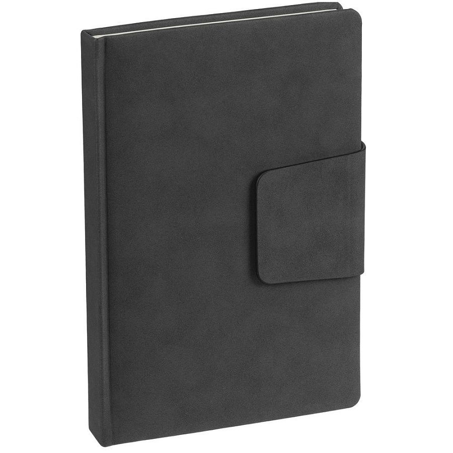 Ежедневник с твердой обложкой c поролоном, выполнен из материала Nubuck, темно-серый ЕЕ, дополнен капталом и ляссе черного цвета. Застежка — магнитный хлястик.