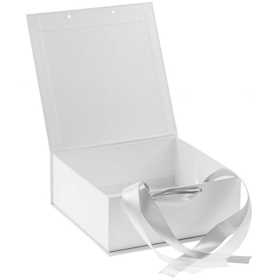 Коробка выполнена из переплетного картона, кашированного дизайнерской бумагой Majestic, с крышкой на лентах.