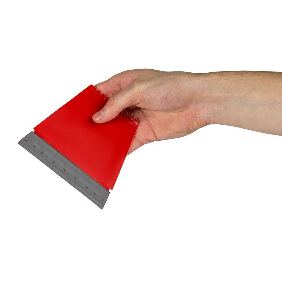 Все 4 стороны скребка рабочие: резиновый водосгон с широкой стороны, зубья-ледорубы с узкой и две скошенные грани по бокам.