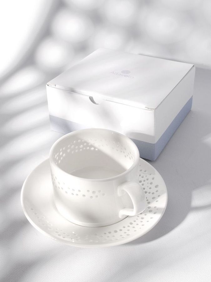 Чайная пара Coralli — легкая, словно светящаяся изнутри посуда с легендарным узором «рисовое зерно». Благодаря тонкому слою прозрачной глазури кружка выглядит кружевной и ажурной, при этом напиток гарантированно остается внутри.