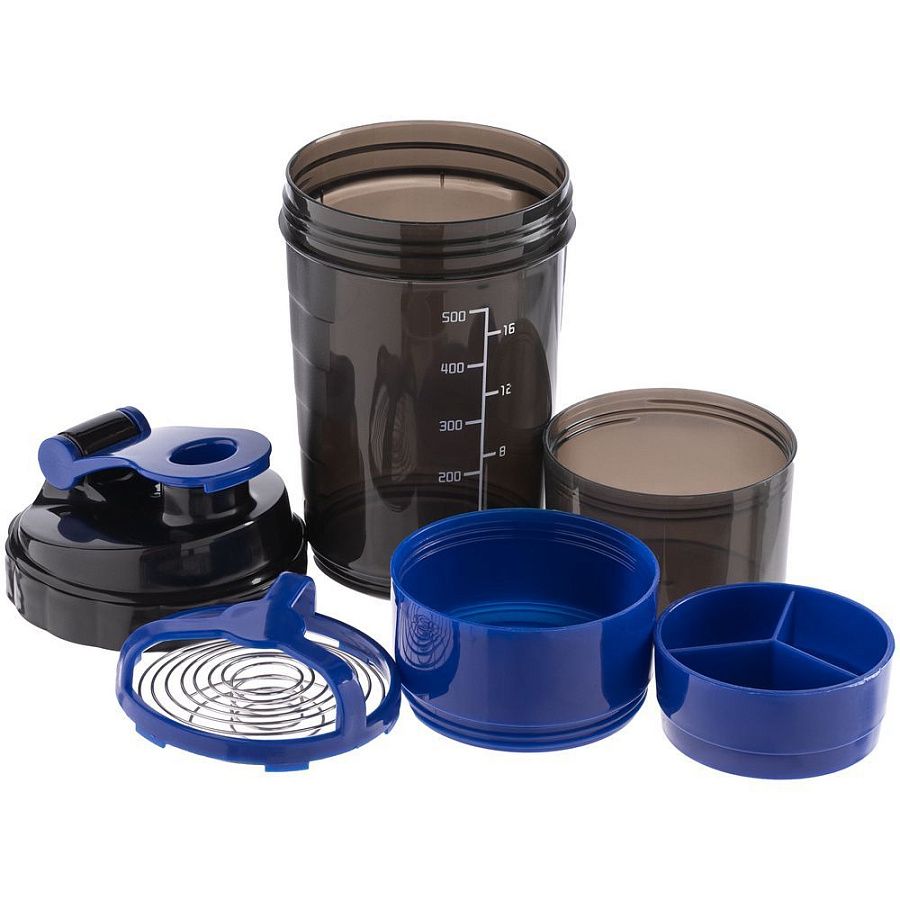 В комплект шейкера входит органайзер для витаминов и 2 чаши для протеинового порошка. Комплектующие закрепляются под корпусом шейкера легким движением. Такая конструкция позволяет иметь под рукой все необходимые ингредиенты для спортивного питания и приготовления протеиновых коктейлей. Шейкер можно использовать как с отсеками, так и без них.