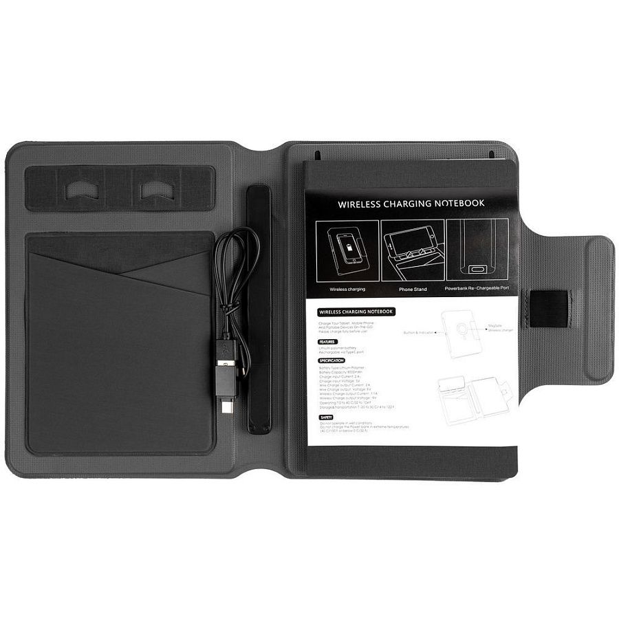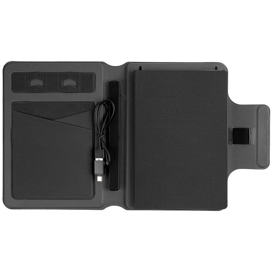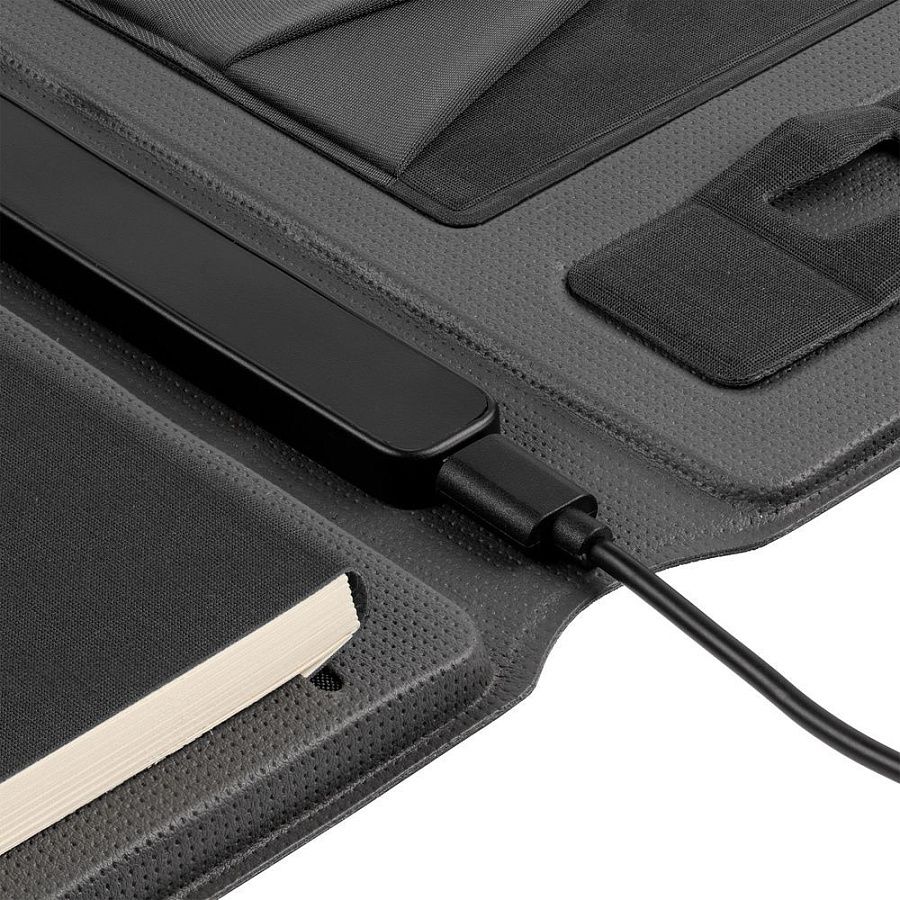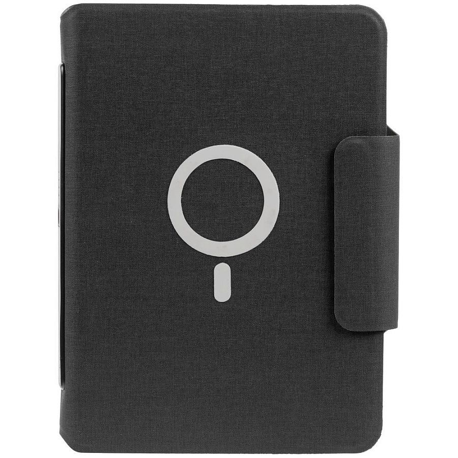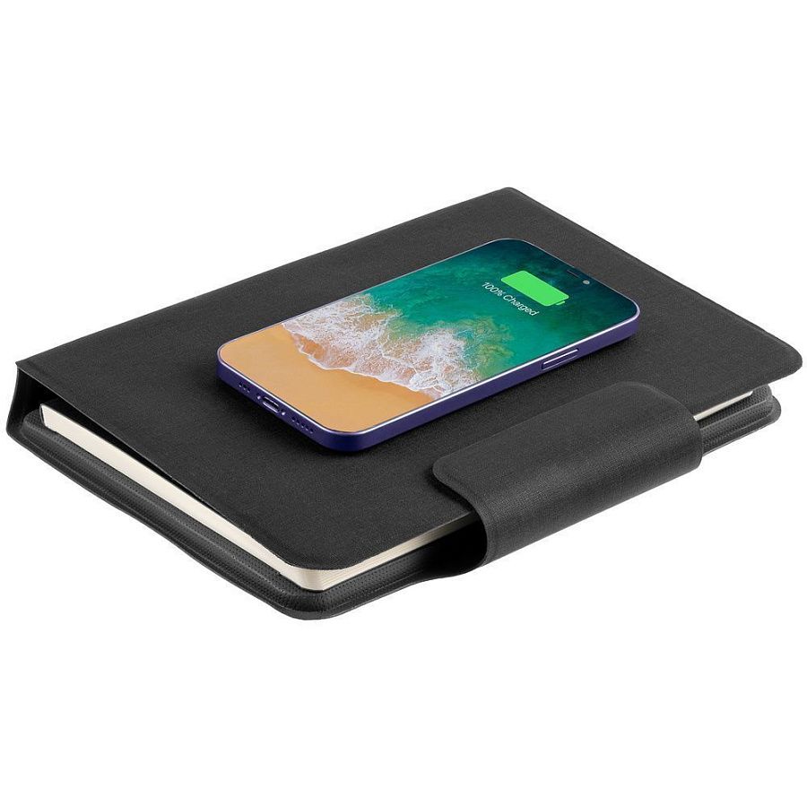 Органайзер с блокнотом и аккумулятором с беспроводной зарядкой. Обложка с фактурой, имитирующей ткань, на магнитной застежке.