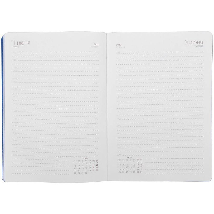 Гибкая обложка ежедневника выполнена из материала Latte, синий НН. Внутри корешка — специальное место для крепления ручки размером до 15х0,9 см.