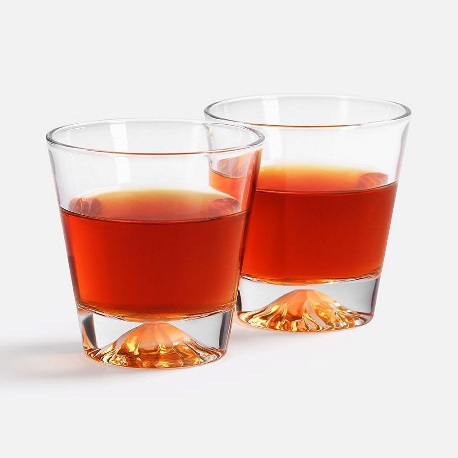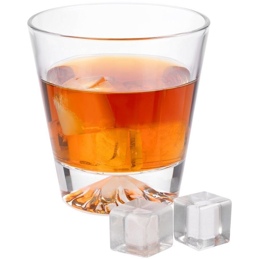 Дно бокалов выполнено таким образом, что кажется, будто в него заключена гора со снежной шапкой, а изготовленные из белого кварца камни для охлаждения напитка выглядят точь-в-точь как кубики льда.
