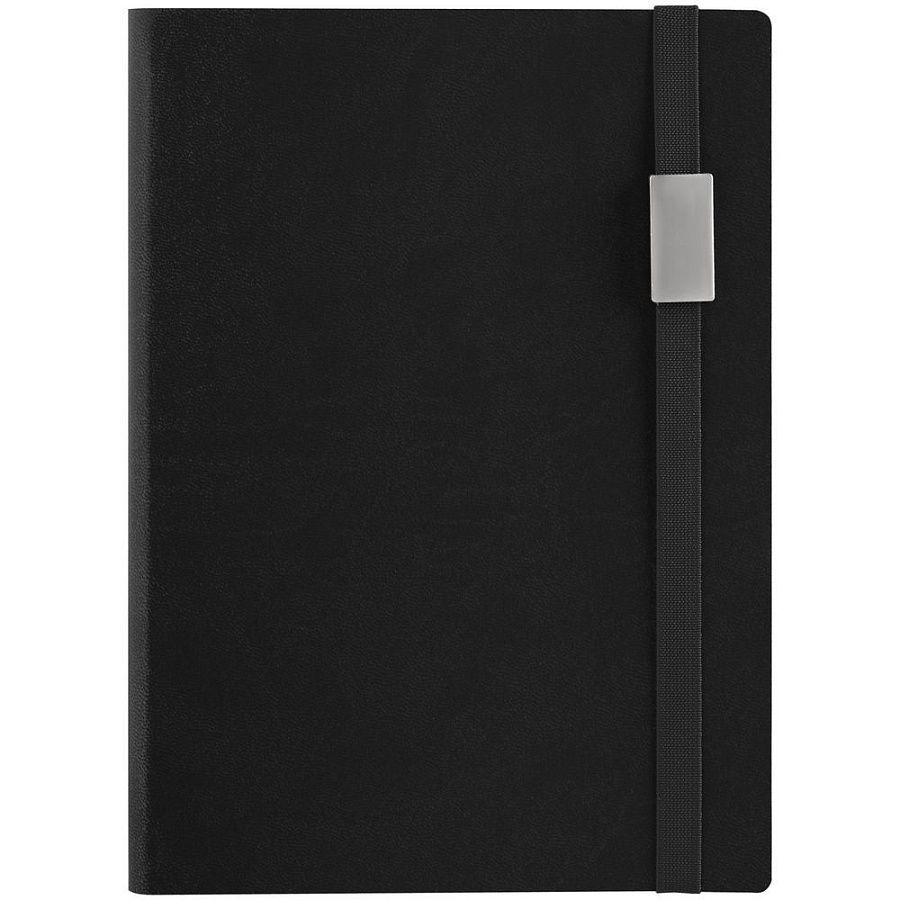 Ежедневник с гибкой обложкой выполнен из материала Brand, черный АА, и дополнен резинкой шириной 1 см с металлическим шильдом, капталом, ляссе черного цвета.