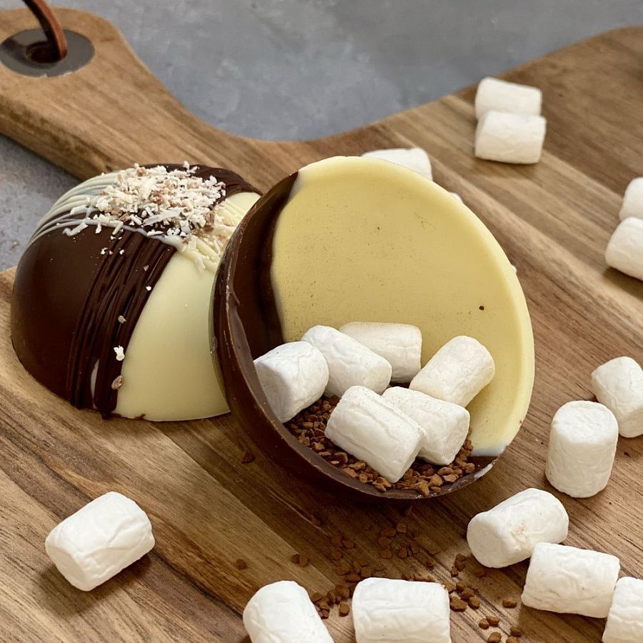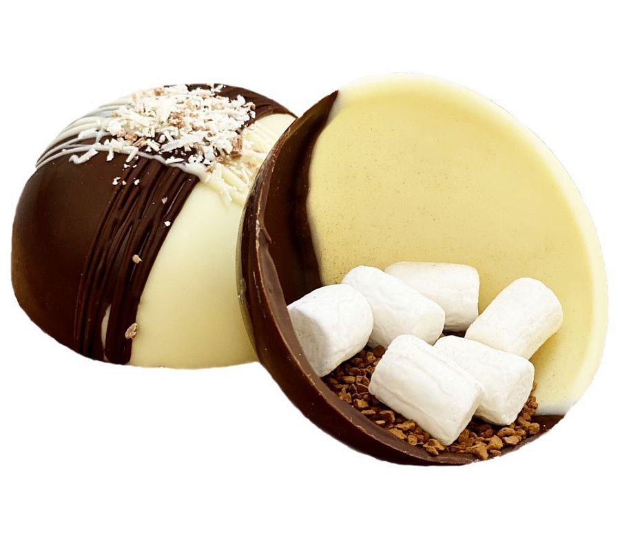 Состав: сфера из темного и белого шоколада, кофе растворимый сублимированный, маршмеллоу.