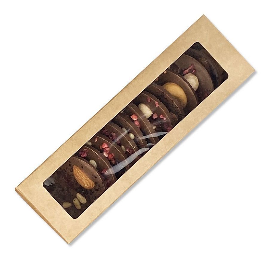 В наборе 12 медиантов из молочного шоколада с посыпкой из сублимированных ягод и орехов.