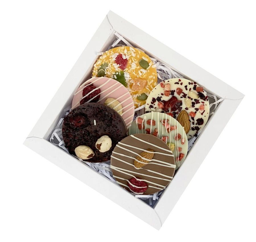 Шоколадные конфеты Mendiants — это яркий праздничный комплимент и настоящее гастрономическое путешествие.В наборе 6 медиантов с разными вкусами: медиант из молочного шоколада с сублимированной малиной и миндалем; медиант из лаймового шоколада с фисташкой и сублимированной клубникой; медиант из темного шоколада с фундуком, клюквой и черной смородиной; медиант из белого шоколада с клюквой; медиант из апельсинового шоколада с тыквенной семечкой и цукатами; медиант из клубничного шоколада с клубникой и миндалем.