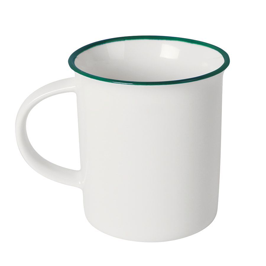 Белое глянцевое покрытие дополняет цветной кант по краю кружки.