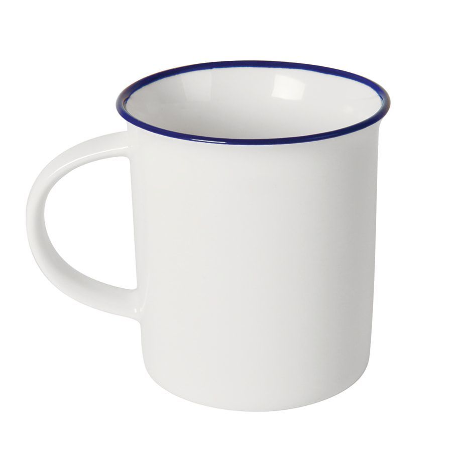 Белое глянцевое покрытие дополняет цветной кант по краю кружки.