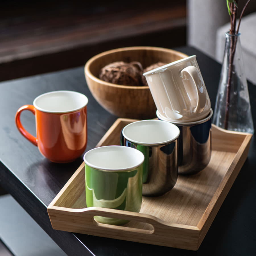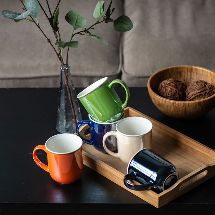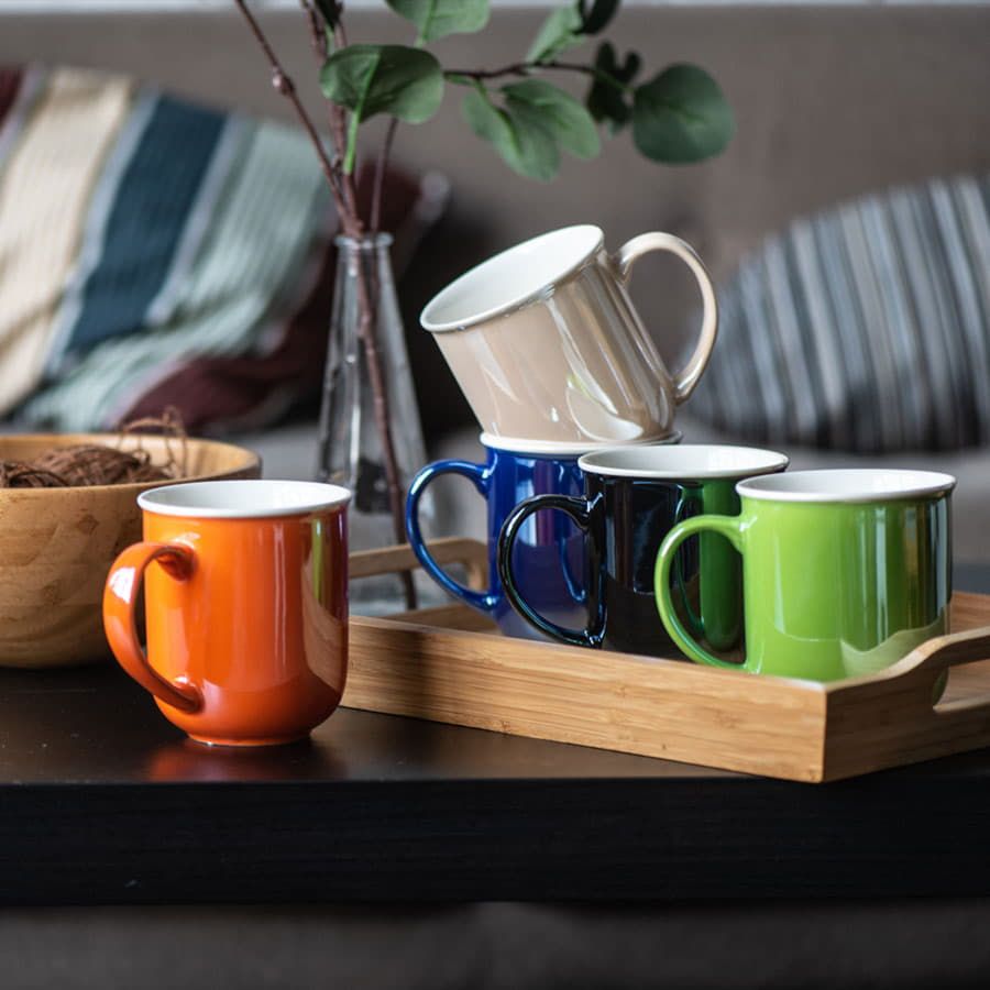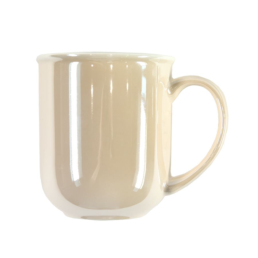 Кружка необычной, скругленной внизу формы, дополнена белым кантом по верхнему краю и актуальным покрытием с жемчужным блеском или эффектом перламутра.