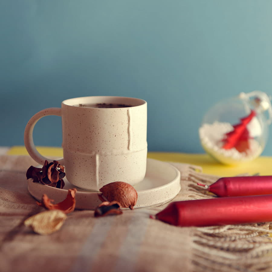 Оригинальная фарфоровая чайная пара цвета топленого молока в легкую крапинку со швами станет эффектным и запоминающимся подарком.