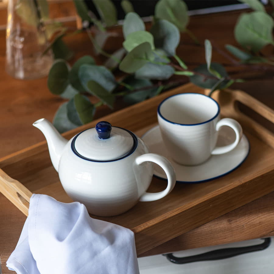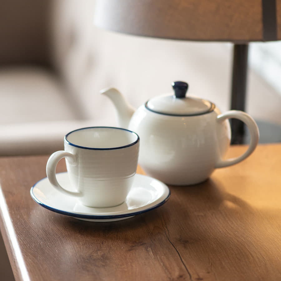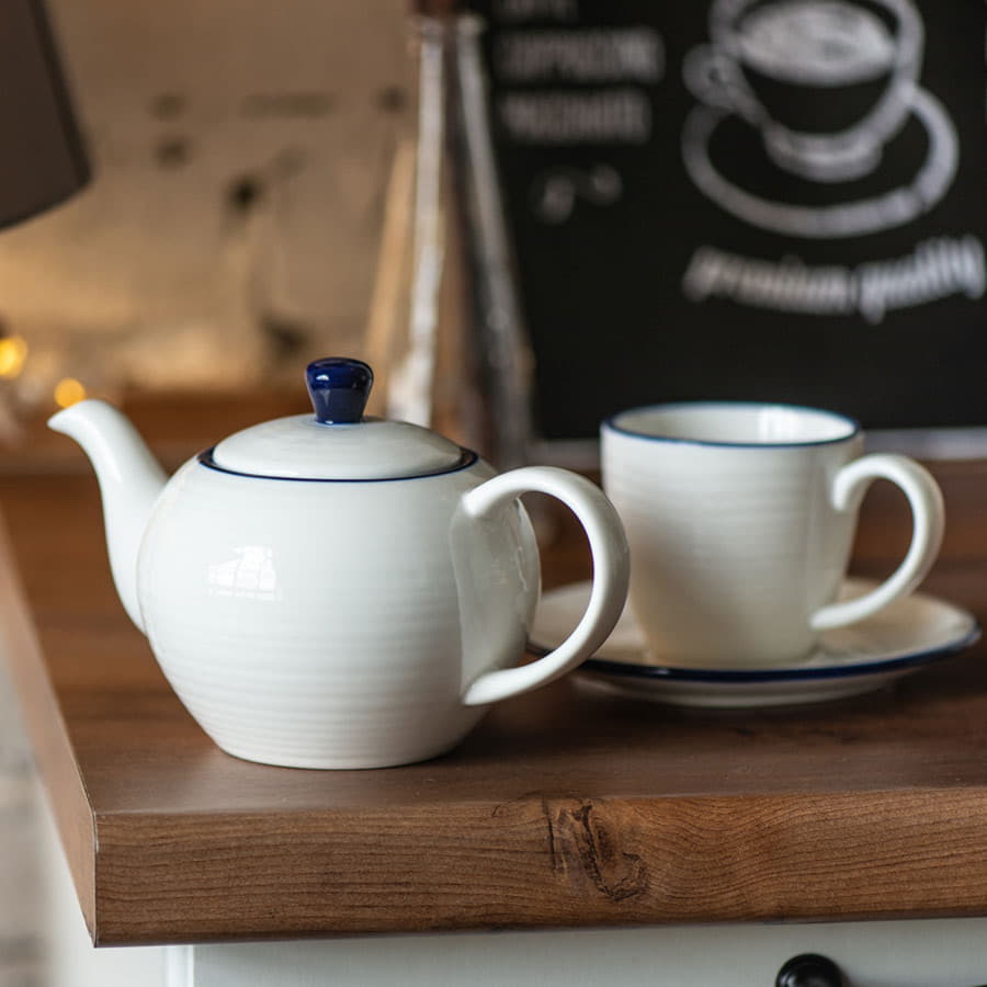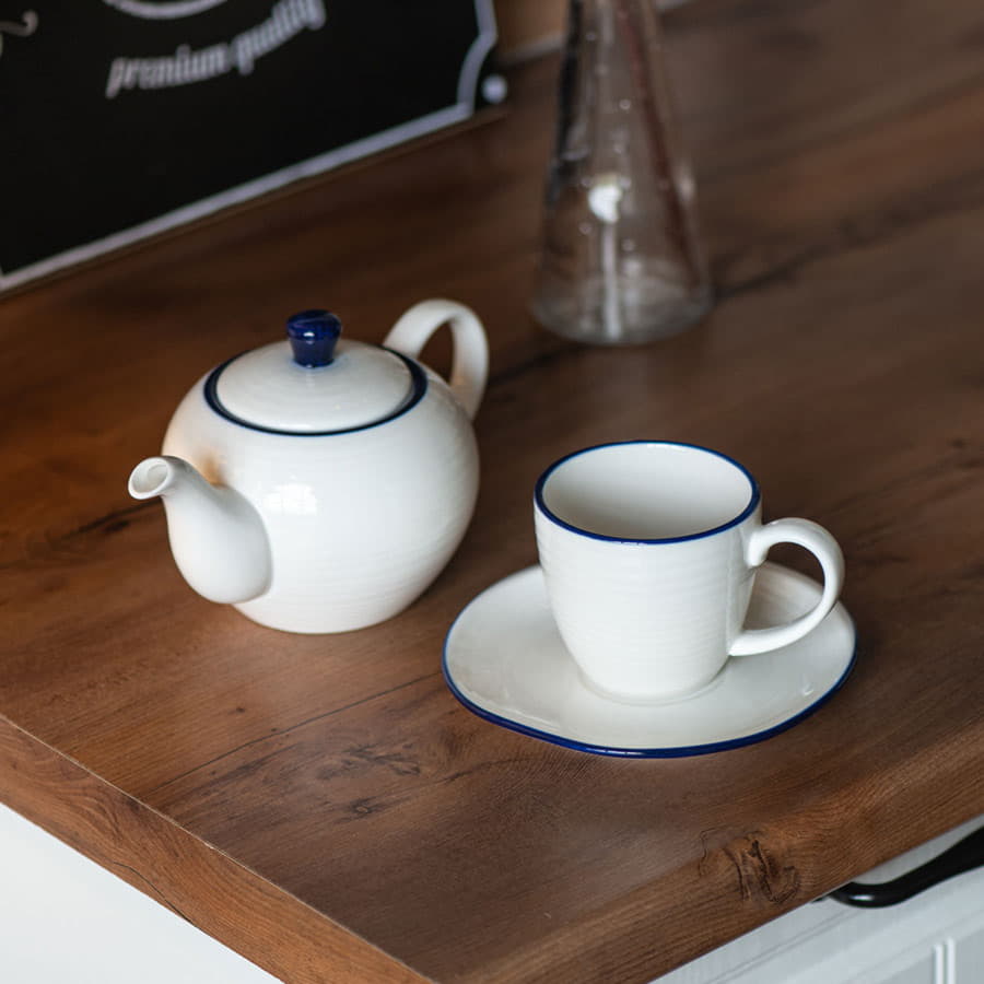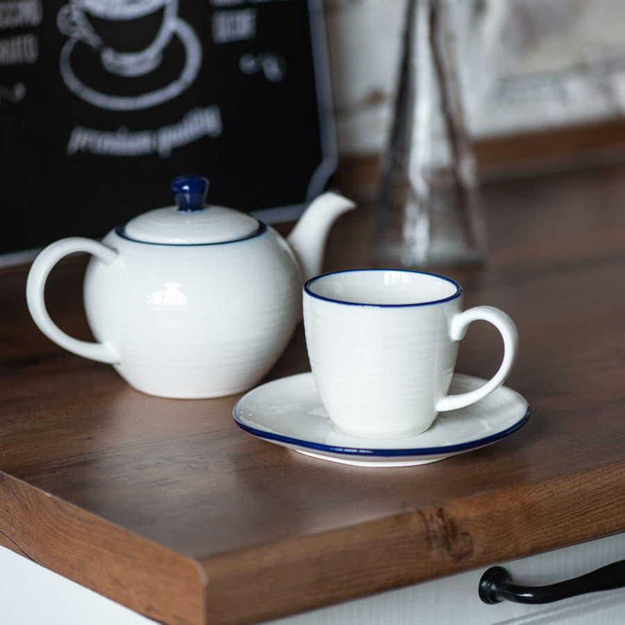 Чайная пара и чайник SEAWAVE выполнены в классическом нежном дизайне. Элегантное сочетание белой посуды с синим кантом всеми давно любимо. Волнообразное покрытие чашки, похожее на рябь на поверхности воды, и подарило название этому комплекту – «морская волна».