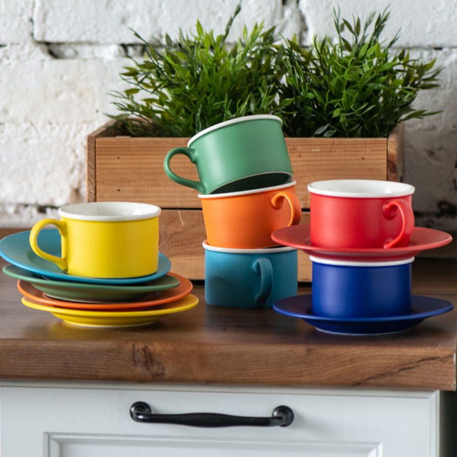 Нежный белый кант по верхнему краю дополняет ассоциацию с тающим мороженым, а блюдце с углублением не позволит чашке случайно соскользнуть.