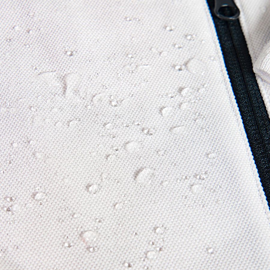 Основная ткань: цвет, близкий к Pantone Standart white Толстовка из полотна "пике" с водоотталкивающей пропиткой. Обратные контрастные молнии для предотвращения попадания влаги внутрь. Рукава-реглан. Декоративная тесьма по горловине спинки. Капюшон на подкладке с небольшой стойкой. Контрастные канты и шнур в капюшоне. Два передних кармана на молнии. Манжеты и низ изделия обработаны плотным рибом 1*1 .