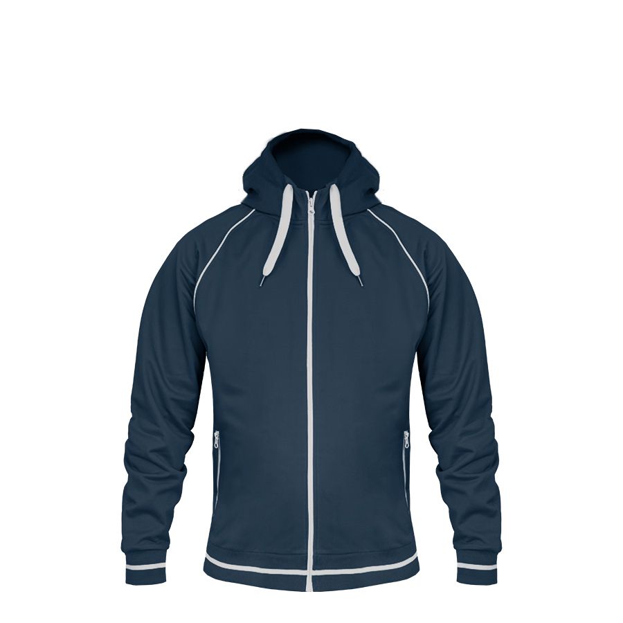 Основная ткань: цвет, близкий к Pantone 296 C Толстовка из полотна "пике" с водоотталкивающей пропиткой. Обратные контрастные молнии для предотвращения попадания влаги внутрь. Рукава-реглан. Декоративная тесьма по горловине спинки. Капюшон на подкладке с небольшой стойкой. Контрастные канты и шнур в капюшоне. Два передних кармана на молнии. Манжеты и низ изделия обработаны плотным рибом 1*1 .