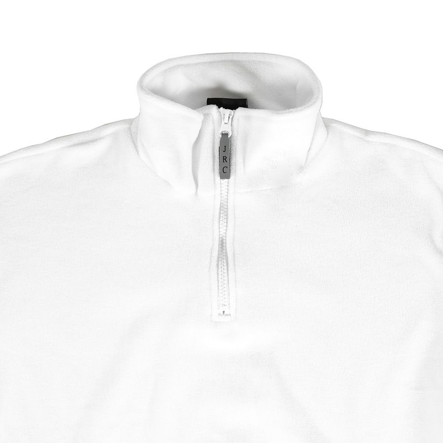 Основная ткань: цвет, близкий к Pantone Standart white Утепленная толстовка повышенной плотности. Удобный воротник-стойка на молнии. Светоотражающий съемный пуллер с символикой JRC. Два кармана на молнии. Утягивающий шнурок по низу изделия. Эластичные резинки по низу рукавов.