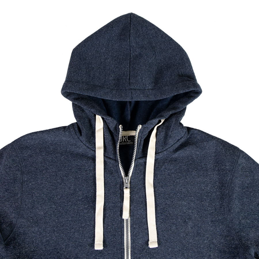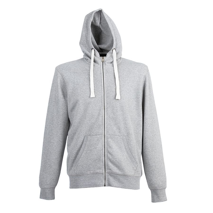 Толстовка с эффектом "меланж". Облегченная пластиковая молния с контрастной тканевой лентой. Капюшон с небольшой стойкой и плоским вытяжным шнуром. Манжеты и низ изделия обработаны рибом 1*1.