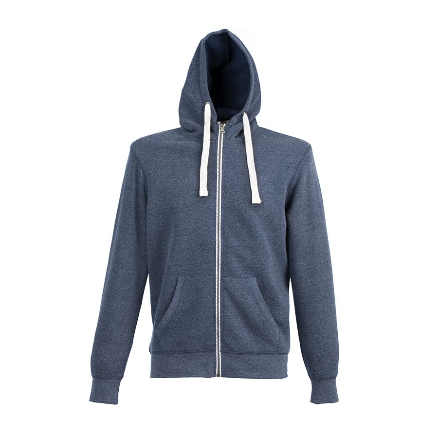 Основная ткань: цвет, близкий к Pantone 5395 U Толстовка с эффектом "меланж". Облегченная пластиковая молния с контрастной тканевой лентой. Капюшон с небольшой стойкой и плоским вытяжным шнуром. Манжеты и низ изделия обработаны рибом 1*1.