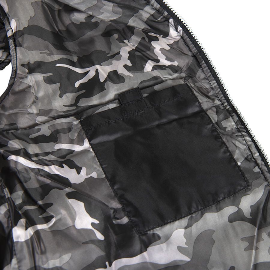 Основная ткань: цвет, близкий к Pantone 7547 С, подкладка: цвет, близкий к 404 U Небольшой воротник-стойка. Контрастная облегченная пластиковая молния со съемным пуллером. Три передних кармана на молнии. Внутренний карман на липучке. Контрастная подкладка камуфляж.