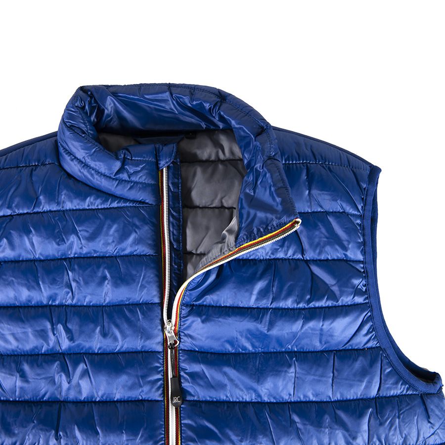 Легкий жилет из нейлона. Небольшой воротник-стойка. Контрастная облегленная пластиковая молния со съемным пуллером. Два передних кармана на молнии. Один внутренний карман на липучке. Cтягивающая эластичная резинка по низу изделия и в рукавах.