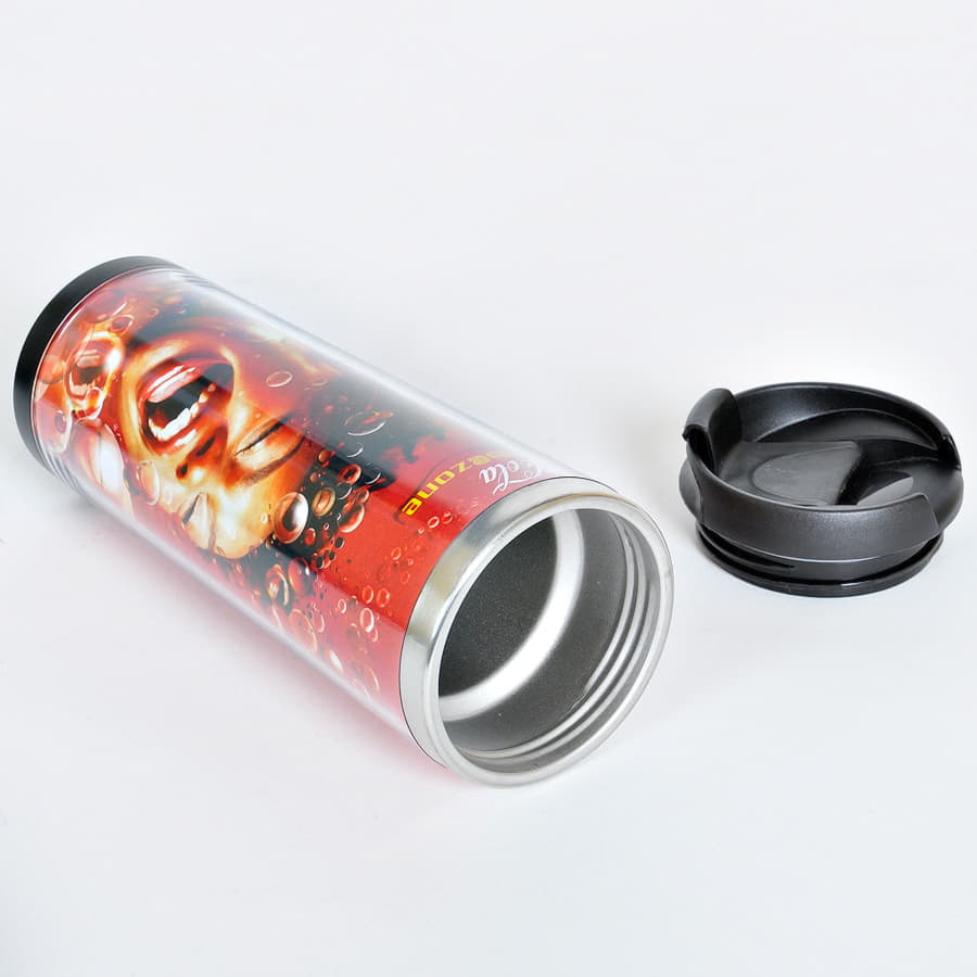 Термокружка с колбой из нержавеющей стали с огромным полем для печати, на котором можно разместить не просто логотип, а целый буклет. Полноцветная вставка занимает всю поверхность стакана и смотрится очень органично. Для сборки и разборки не требуются клей или специальные инструменты - изображение помещают в пространство между внешним и внутренним слоями корпуса.