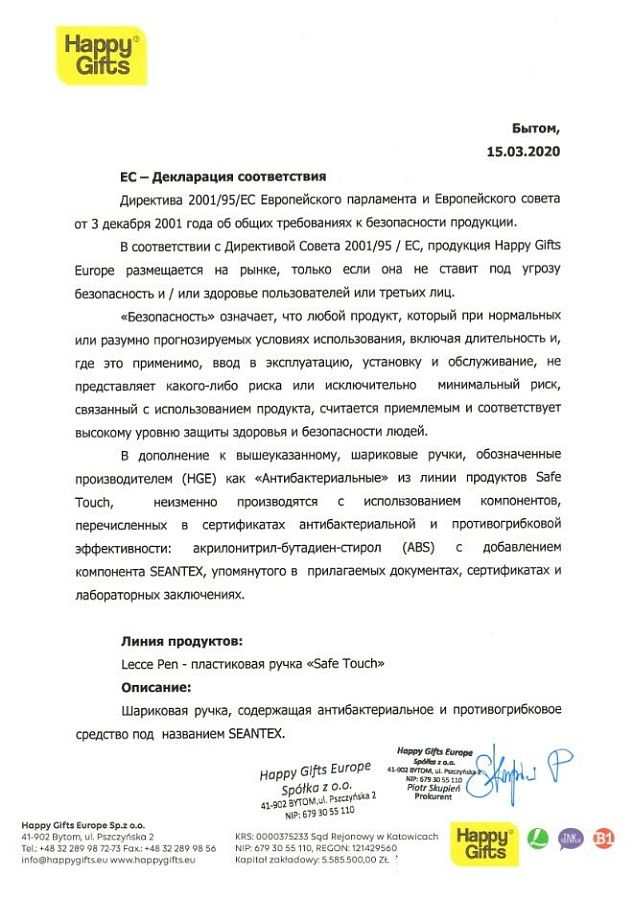 - официальное письмо о безопасности материалов ручек SafeTouch.